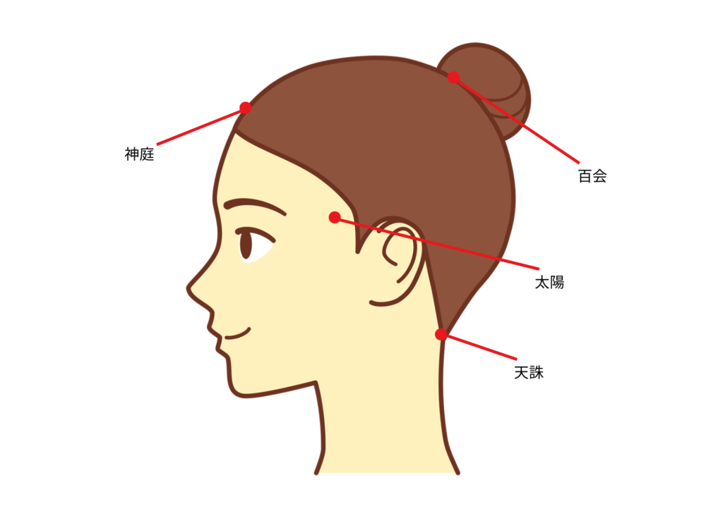 - 太陽:こめかみにあります。眉尻と目尻の間から少し外側に指1本分ずらしたあたり。